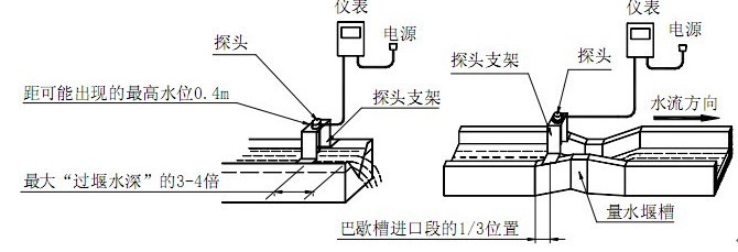 超聲波明渠流量計的探頭可以直接安裝在量水堰槽水位觀測點(diǎn)的上方。探頭發(fā)聲的一面要對準(zhǔn)水面??梢杂盟匠叻旁谔筋^上蓋上,通過校上蓋水平使探頭對準(zhǔn)水面。巴歇爾槽水位觀測點(diǎn)在距喉道2/3收縮段長位置(如圖);三角堰、矩形堰在上游一側(cè),距堰板3~4倍最大過堰水深處