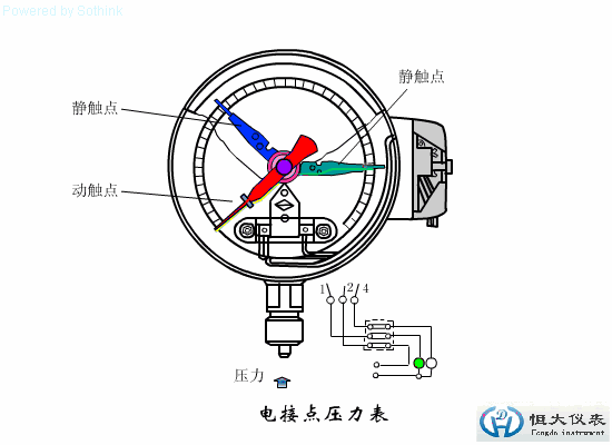 電接點(diǎn)壓力表具有抗介質(zhì)脈動(dòng)和沖擊載荷,耐環(huán)境振動(dòng)等優(yōu)異特性,適用測(cè)量對(duì)銅和銅合金無腐蝕性的氣體,液體或蒸 汽等壓力。儀表設(shè)上、下限二位開關(guān)型接點(diǎn)裝置,在壓力達(dá)到設(shè)定值時(shí)發(fā)出信號(hào)或通斷控制電路,供作業(yè)系統(tǒng)自動(dòng)控制或發(fā)訊用。其抗振結(jié)構(gòu)可有效抑制指針的抖動(dòng)、沖擊,保護(hù)接點(diǎn),使儀表指示清晰,電信號(hào)切換可靠,工作穩(wěn)定。