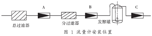 渦街流量計(jì)應(yīng)用在發(fā)酵系統(tǒng),筆者了解到各企業(yè)安裝位置如圖1)有A、B.C三處不同位置,現(xiàn)作淺述。