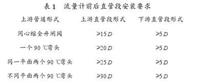 (3)流量計(jì)在安裝時(shí)其上游和下游應(yīng)配置一定長(zhǎng)度的直管段,其長(zhǎng)度應(yīng)滿足表1的要求。