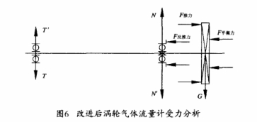 改進(jìn)后氣體渦輪流量計(jì)通過(guò)自身的調(diào)節(jié),依靠不同流量下葉輪轉(zhuǎn)動(dòng)的速度不同,產(chǎn)生不同的推力,通過(guò)這個(gè)推力,平衡垂直于葉輪端面的氣流推力(圖6),使得固定軸承在水平方向上所承受的F反推力有所降低,這樣大大改善了固定軸承的受力狀況,延長(zhǎng)軸承的使用壽命,并且由于軸承的摩擦力減小,軸承的運(yùn)轉(zhuǎn)精度得到進(jìn)-步提高,儀表的精度也會(huì)提高。