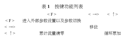 AD轉(zhuǎn)換器采集角位移傳感器輸出電壓信號(hào),采集時(shí)間間隔為10ms,采集的電壓值經(jīng)數(shù)字濾波后,用于流量計(jì)算;鍵盤(pán)處理模塊采用中斷方式,根據(jù)鍵值,實(shí)現(xiàn)表1所示功能。