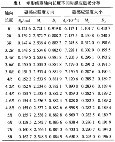 電磁流量計(jì)中的矩形線圈,將所考慮橫截面區(qū)域劃分成41x41個(gè)網(wǎng)格,令矩形線圈的寬為6cm,等于管道內(nèi)徑2R。每個(gè)勵(lì)磁線圈的匝數(shù)為6,厚度為2cm,2個(gè)線圈之間的距離為6cm,緊貼測(cè)量管壁,線圈中電流強(qiáng)度為10mA。首先令矩形線圈軸向長(zhǎng)度的范圍從R到8R,間隔為R;其次,在前面所確定最優(yōu)尺寸4R附近,提高尺度分辨率,從3R到5R,間隔為0.2R??疾榫匦尉€圈在測(cè)量管橫截面上的感應(yīng)磁場(chǎng)分布情況,如表1所示。