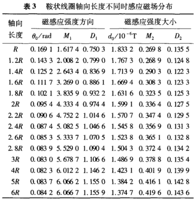 取鞍狀線圈圓弧段的弧度為154°,首先取線圈的軸向長(zhǎng)度范圍R~6R,間隔為R;其次在最優(yōu)尺寸2R附近,提高尺度分辨率,從R到3R,間隔為0.2R。考查鞍狀線圈在電極橫截面上的感應(yīng)磁場(chǎng)分布情況,如表3所示。