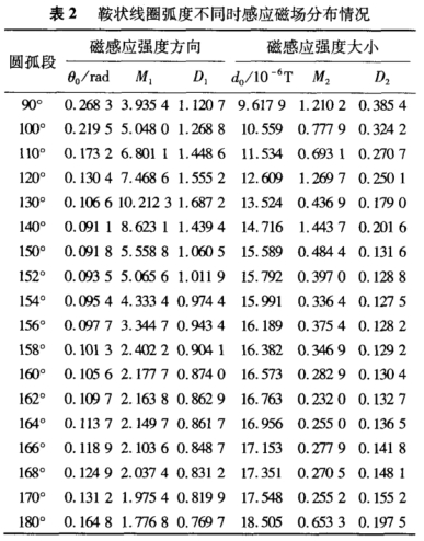 由表2可知,當(dāng)鞍狀線圈圓弧段的弧度為154°時(shí),D2達(dá)到最小值,D、取值0.9744,同時(shí)感應(yīng)磁場(chǎng)方向指標(biāo)θ。為0.0954,與最小值0.0911相差不大,綜合考慮選鞍狀線圈圓弧段的最優(yōu)弧度為154°。