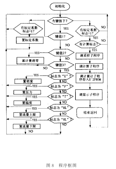 軟件設(shè)計流程如圖8所示。可實現(xiàn)雙排8位LCD同時顯示累積流量和瞬時流量;通過儀表界面3個按鍵可將標(biāo)定曲線系數(shù)、小數(shù)位數(shù)、被測介質(zhì)的密度、溫度、壓力、壓縮系數(shù)等工況參數(shù)直接置入單片機(jī),自動完成刻度換算,實現(xiàn)流量的精確測量,給不同要求用戶的使用帶來極大方便,無需逐臺設(shè)計制造,與國際同類研究成果相比較,金屬管浮子流量計顯示出更強(qiáng)的智能化水平。
