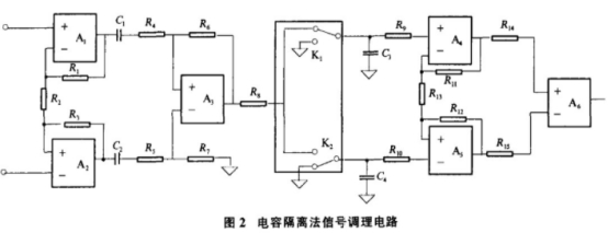 現(xiàn)在很多電磁流量計(jì)的信號(hào)處理方法采用了電容隔離法,電容隔離法是將零點(diǎn)漂移近似作為直流.處理的一種方法,即通過電容耦合來隔離零點(diǎn)漂移干擾,實(shí)現(xiàn)對(duì)感應(yīng)電勢信號(hào)的提取.放大處理.基本電路如圖2.