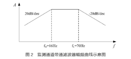 渦街流量計設(shè)計了一個由轉(zhuǎn)折頻率為fL=fmax/2=70Hz的一階低通濾波器與轉(zhuǎn)折頻率為fH=8*fmin=16Hz的一階高通濾波器組成的帶通濾波器作為“監(jiān)測通道”。圖2為“監(jiān)測通道”的幅頻曲線示意圖。