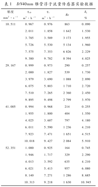 對(duì)量程范圍1~10m³/h、精度等級(jí)1.5級(jí)的DN40mm浮子流量傳感器進(jìn)行實(shí)驗(yàn)研究。qxo是刻度流量,qvomax為流量傳感器量程上限,qv是實(shí)際流量,δ1是滿度誤差,δ1=|(qy0-qy)1/qxomax100%,實(shí)驗(yàn)數(shù)據(jù)見(jiàn)表1。