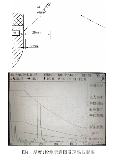 由于焊縫未與噴嘴融合在一-起,無法利用斜探頭測(cè)量焊縫厚度,所以必須磨平一小塊焊縫余高,磨平范圍約為直探頭大小,將直探頭置于磨平余高焊縫處,此處接收到的最大回波信號(hào)所示深度即為焊縫厚度t。同樣利用測(cè)厚儀也可測(cè)量出焊縫厚度。