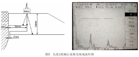 流量計(jì)直探頭得到兩個(gè)回波信號(hào)(分別為環(huán)室反射信號(hào)、平底反射信號(hào)),根據(jù)超聲波大平底面回波聲壓與距離的反比關(guān)系,△12=201gx2/x1,以DG1為例,計(jì)算出兩個(gè)回波差值△=5db,根據(jù)閘門移動(dòng)或設(shè)置雙閘門,比較回波的db差值,來判斷直探頭發(fā)射點(diǎn)是否處在環(huán)室的邊緣。最后通過鋼直尺測(cè)量焊縫邊緣與探頭中心的水平距離,即得到環(huán)室長(zhǎng)度1。