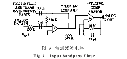 如圖3所示,由TLC27組成的濾波器是帶通濾.波器,用來減少接收信號的噪聲干擾.濾波器還用來消除波形中的尖峰,從而使接收到的信號變得平緩.TLC37組成的數(shù)字方波產(chǎn)生回路把經(jīng)過TLC27濾波后的正弦波轉變成相應的方波,以便于HT2012接收.