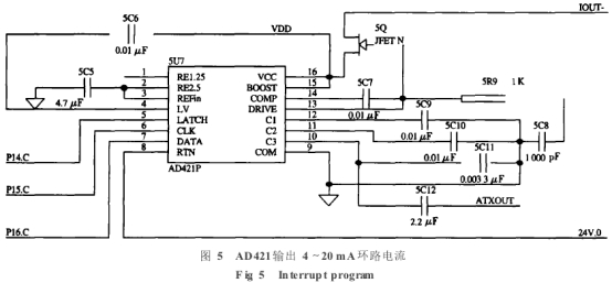 AD421其內部的電壓調節(jié)器與外部的場效應管DN25D對輸入到AD421的電壓進行調整,可提供十33V電壓作為其他設備的電源.HART發(fā)出的FSK信號,經(jīng)過一個電容耦合送到AD421中,轉換成相應的0.5mA正弦電流信號,實現(xiàn)電壓信號到電流信號的轉換,同時,疊加在4~20mA的電流.上送給接收設備,實現(xiàn)了