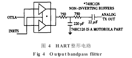 如圖4所示,緩沖器74HC126的作用是使方波的.上升沿和下降沿趨于平緩,使信號滿足HART物理層規(guī)范所要求的信號波形上升沿和下沿的時要求,因為較平緩的上升沿和'下降沿時間可以降低與其它網(wǎng)絡間的串擾.