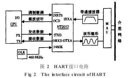 HT2012芯片用來實現(xiàn)HART協(xié)議中通訊信號的解調及調制過程.圖2為調制解調器與微處理器的連接.
