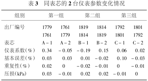 將每組儀表的2臺表芯對換,重新進行檢定,獲取檢定數(shù)據(jù),列于表2。將同表芯的2臺儀表參數(shù)進行比較,獲得比對結果,列于表3。其中儀表系數(shù)以相對變化(百分數(shù))表示。