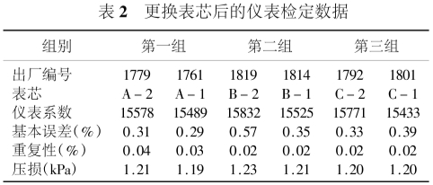 由表3中數(shù)據(jù)可以看出,渦輪流量計的儀表系數(shù)主要和表芯有關,這是由于表芯幾乎集中了該表的所有重要零部件,包括影響儀表性能的軸承和葉輪。渦輪流量計一次表的損壞主要是軸承和葉輪,因此既不提倡單獨更換軸承或葉輪進行維修,也不需要更換整臺儀表,而是采用整體更換表芯的方式即可。每一個用于維修的表芯都需要進行單獨標定,每一個表芯都可確定一個儀表系數(shù),更換表芯后,輸入新的儀表系數(shù)就可以投入使用了。