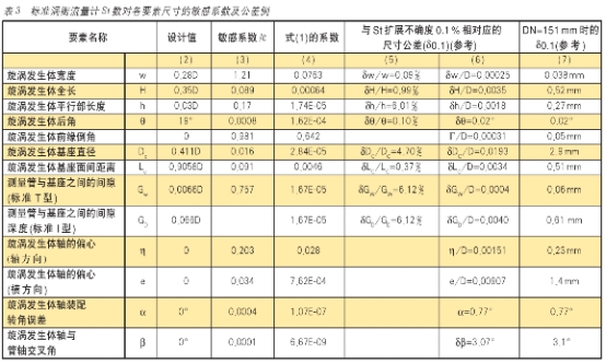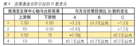 測量通道臺階影響:“解說“闡明儀表測量內(nèi)徑和前后管路內(nèi)徑差異形成臺階影響的實驗數(shù)據(jù)圖3幀,文件認為試驗尚不夠充分,因此未納入《標準》正文。所例舉儀表內(nèi)徑151mm,測量管長151mm,旋渦發(fā)生體置于中點,連接到3種內(nèi)徑:A=146.5mm、B=1555mm、C=159.2mm的前后直管,按臺階與旋渦發(fā)生體軸間距作4組配置,即(1)上游側(cè)0.5D,下游測0.5D;(2)上游側(cè)1D,下游側(cè)0.5D;(3).上游側(cè)0.5D,下游側(cè)1D;(4).上游側(cè)1D,下游側(cè)1D。所測得的St數(shù)與無臺階管段相比,變化如表4。從中可看出:前后直管內(nèi)徑小于儀表測量管內(nèi)徑比大于測量管內(nèi)徑影響大:后臺階的影響大于前臺階的影響。筆者認為渦街流量計后直管內(nèi)徑與儀表內(nèi)徑差的影響比前直管大這一現(xiàn)象,與其他流量儀表(如節(jié)流差壓流量計、渦輪流量計、電磁流量計)前直管影響大的常例相反.值得關(guān)注。