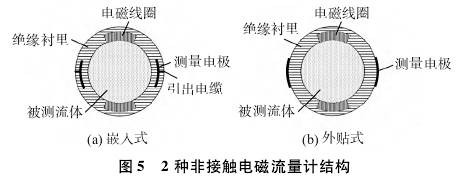 非接觸式電磁流量計(jì)的電極與被測流體間有絕緣襯里隔離或者直接采用絕緣測量管。電極貼于測量管外面或鑲嵌于測量管內(nèi)部。非接觸式電磁流量計(jì)利用電極與被測流體通過絕緣襯里形成耦合電容來檢測被測流體流量信號。主要結(jié)構(gòu)形式按電極的安裝位置可分為兩種:電極嵌人測量管絕緣襯里(嵌人式)、電極貼在測量管外(外貼式)。嵌入式電磁流量計(jì)和外貼式電磁流量計(jì)的結(jié)構(gòu)如圖5所示,嵌人式結(jié)構(gòu)和普通電磁流量計(jì)電極結(jié)構(gòu)類似,而外貼式多是采用陶瓷表面金屬化將電極貼在流量計(jì)測量管外部。