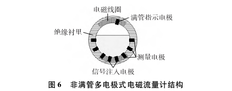 1)非滿管多電極式電磁流量計(jì)。其測量管壁上具有多對電極,其中1對信號注人電極設(shè)置在測量管底部,用于滿管狀態(tài)判別的滿管指示電極設(shè)置在測量管頂部,其余3對電極為測量電極設(shè)置在測量管兩側(cè),用于管道流體液.位和流速信號的測量。當(dāng)對液位進(jìn)行測量時(shí),將電壓幅值恒定的交流信號施加于信號注人電極上,在流體滿管情況下,該流量計(jì)的功能與普通的電磁流量計(jì)相同,因?yàn)榇藭r(shí)流體流經(jīng)橫截面積是固定的,只需根據(jù)感應(yīng)電動勢推出被測流體的流速,進(jìn)而計(jì)算得到流量值。當(dāng)流體未充滿管道時(shí),滿管指示電極檢測到管道流體為非滿管狀態(tài),并利用算法對測量值進(jìn)行修正,此時(shí)流量計(jì)的測量方式則是測量流體流速和非滿管流體液位高度。通過測量管內(nèi)被測液體的耦合,反映液位高度變化的合成信號可以通過3對測量電極得到,液位高度的準(zhǔn)確測量值是通過轉(zhuǎn)換器將合成信號轉(zhuǎn)換獲得。非滿管多電極電磁流量計(jì)結(jié)構(gòu)簡圖如圖6所示。