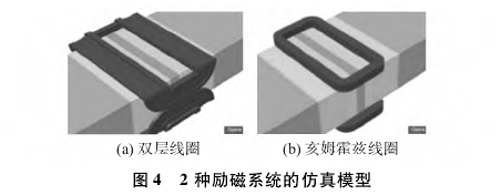為了使明渠流量計(jì)測量區(qū)磁場達(dá)到最佳均勻性,將雙層線圈和亥姆霍茲線圈兩種勵(lì)磁線圈進(jìn)行仿真比較,圖4為雙層勵(lì)磁線圈和亥姆霍茲線圈的仿真模型,發(fā)現(xiàn)雙層線圈的設(shè)計(jì)要優(yōu)于亥姆霍茲線圈,如果在亥姆霍茲線圈中,在流向方向上使線圈長度增加50%,則得到的磁場分布均勻性與在雙層線圈中相同。因此,雙層勵(lì)磁線圈結(jié)構(gòu)相比亥姆霍茲勵(lì)磁線圈更適用于明渠電磁流量計(jì)。