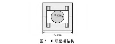 E形框架亥姆霍茲線圈是一種在傳統(tǒng)的亥姆霍茲線圈中加入導(dǎo)磁材料制成的E形框架來模擬磁場的分布的改進(jìn)勵(lì)磁結(jié)構(gòu)。常用的勵(lì)磁裝置亥姆霍茲線圈具有2個(gè)平行排列的線圈,并且測量管中的磁流場是2個(gè)線圈產(chǎn)生的磁場的疊加。為了減少在線圈邊緣漏磁通的影響,一種由導(dǎo)磁材料構(gòu)成的E形勵(lì)磁框架,如圖3所示。線圈纏繞在E形框架的中心,整個(gè)勵(lì)磁裝置由2個(gè)彼此相對放置的E形框架組成。線圈形狀是矩形的,由于E形框架具有高導(dǎo)磁率,磁力線可以集中在E形框架的中心區(qū)域,以提高穿過測量管的磁場的強(qiáng)度和均勻性,并且可以減小激勵(lì)裝置的尺寸。其中,E形框架亥姆霍茲線圈沿著測量管的軸向長度是48mm,即測量管半徑的3倍。此種結(jié)構(gòu)具有漏磁小、磁場分布均勻等優(yōu)點(diǎn)??蓪⒋磐考性跍y量管周圍的區(qū)域以確保有足夠的磁場強(qiáng)度來檢測流量流速信號。.