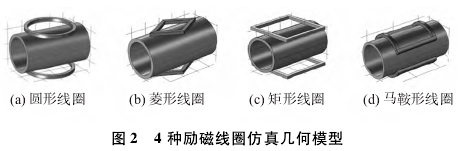 工業(yè)生產(chǎn)中廣泛應(yīng)用的勵(lì)磁線圈的形狀主要有圓形線圈、菱形線圈矩形線圈、馬鞍形線圈等。4種勵(lì)磁線圈的仿真幾何模型如圖2所示。典型的線圈結(jié)構(gòu)仍存在一些不足,如亥姆霍茲線圈中部的工作磁場均勻度較好,而邊緣處磁場卻減弱;菱形勵(lì)磁線圈和矩形勵(lì)磁線圈產(chǎn)生的工作磁場在電極附近的分布均勻度較差;馬鞍形勵(lì)磁線圈的磁場.均勻度最好,但輸出感應(yīng)電動勢大小比亥姆霍茲線圈低。
