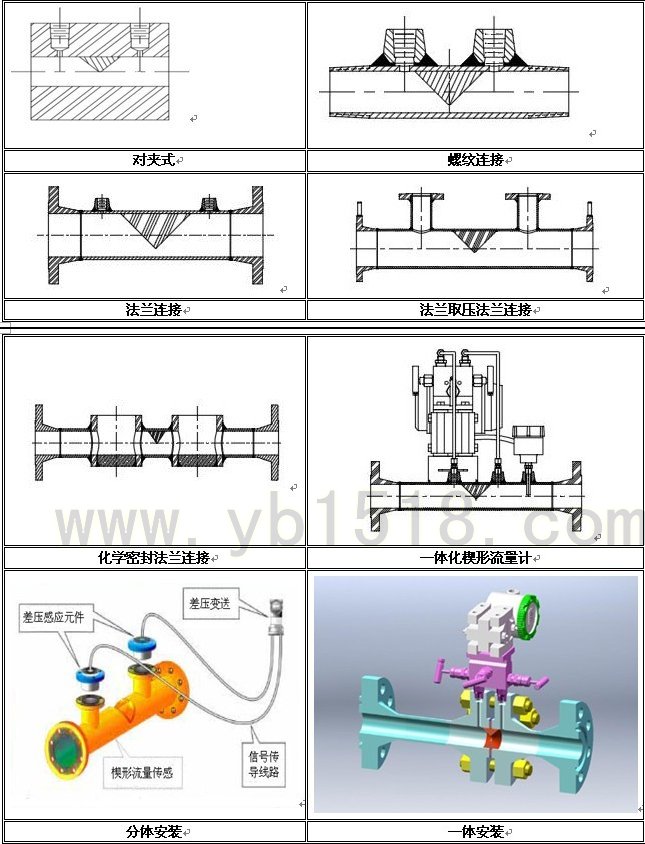 楔形流量計按其組裝方式分為一體型和分離型,按其連接方式分為法蘭連接、焊接連接、螺紋連接及對夾式連接,按其取壓方式分為普通取壓、法蘭密封取壓等結(jié)構(gòu)。詳見下表: