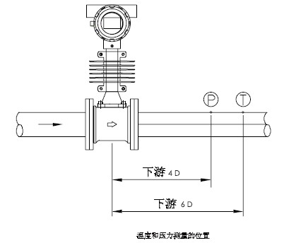 3.當(dāng)需要將實測壓力和溫度信號用于補償質(zhì)量流量或標準流量時,請在氣體流量計下游安裝壓力和溫度變送器。