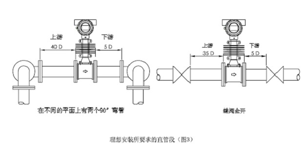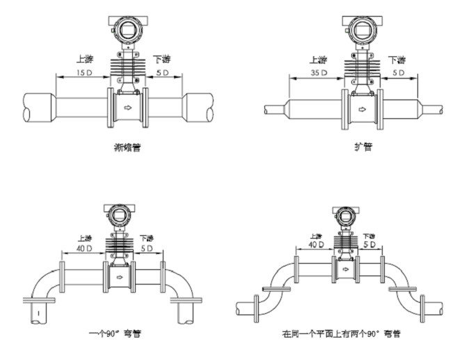 如果安裝點上的上游有漸擴管,上游應(yīng)有不小于18D(D為管道直徑)的等徑直管段,下游應(yīng)有不小于5D的等徑直管段